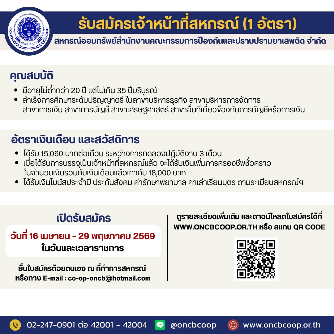 ประกาศรับสมัครคัดเลือกบุคคลเพื่อจัดจ้างเป็นเจ้าหน้าที่สหกรณ์ออมทรัพย์สำนักงาน ป.ป.ส. จำกัด